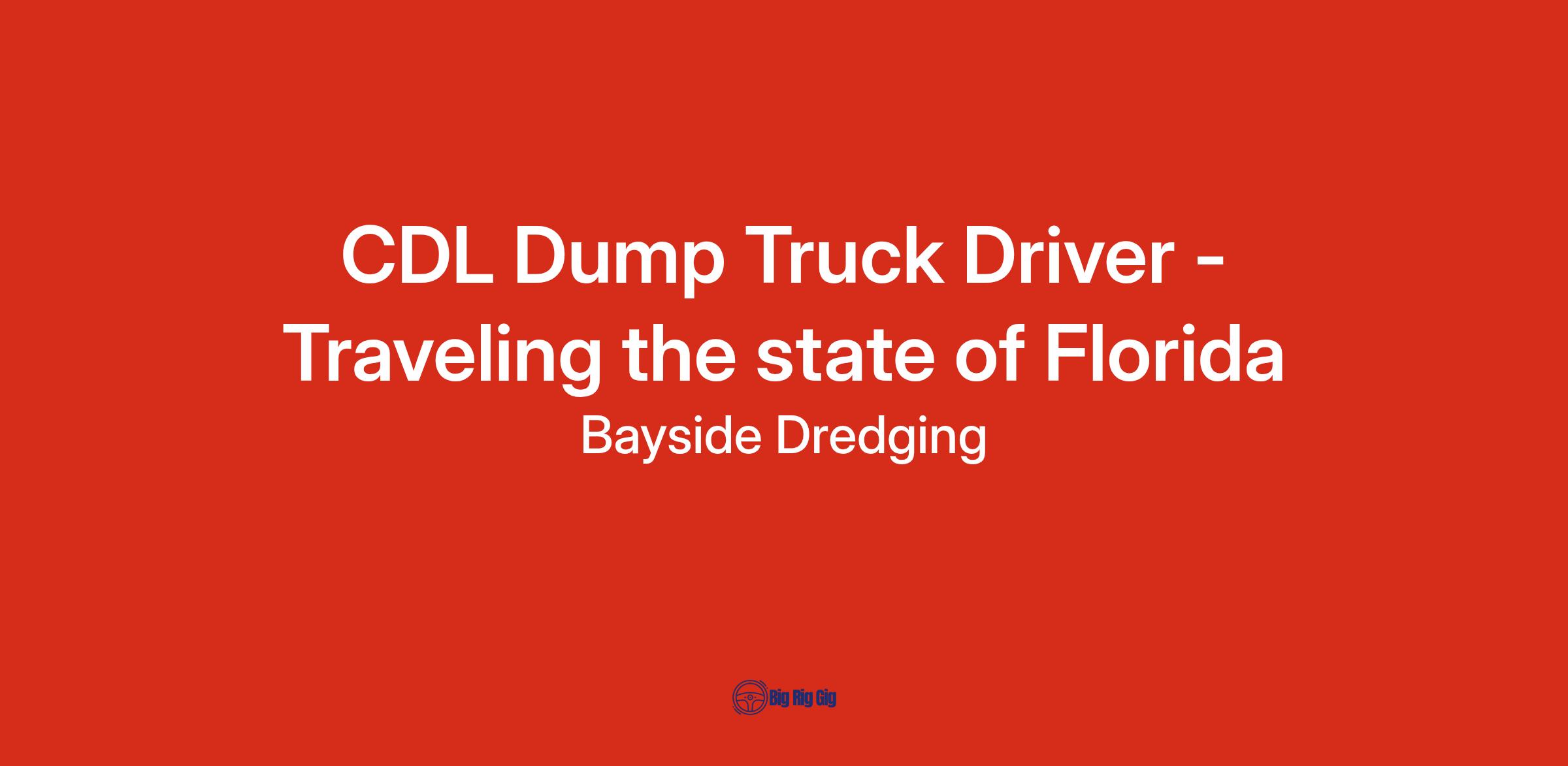 Bayside Dredging, LLC of Clearwater, FL is looking to hire a full-time CDL Dump Truck Driver - ABLE TO TRAVEL THE STATE OF FLORIDA. This position will take you out of town for periods of time, from days to months. Do you want a career opportunity with quick advancement. Are you hardworking, organized, and detail-oriented? Do you want to join a successful business that believes in open, transparent communication? Would you like to work with a company that values and respects you? If so, please read on!