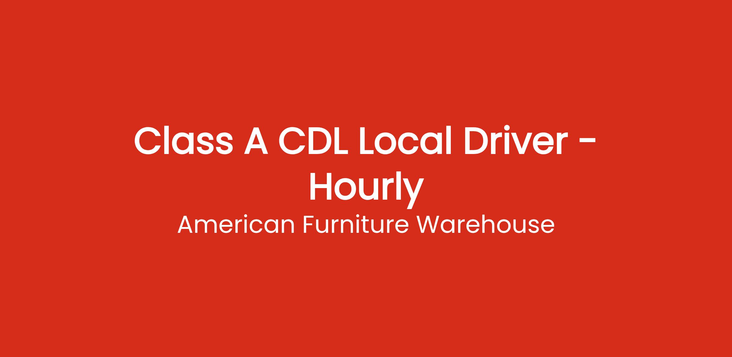 DescriptionAs a Class A CDL Local Driver, you will be responsible for the safe timely delivery and pickup of goods at various locations across the state. You will be tasked with driving and maintaining trucks that will be assigned to you, as well as working closely with our team of dispatchers who are planning routes and tracking deliveries. The ideal Class A CDL Local Driver adheres to American Furniture Warehouseβs quality expectations and standards and is committed to under promising and over delivering to our customers. At AFW the number one concern truly is safety and compliance, and we are looking for drivers who believe in the same, at AFW we don't hire resumes, we hire people!