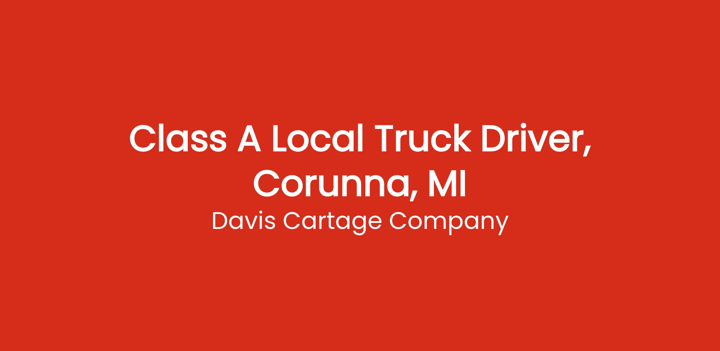 We are hiring a Class A Truck Driver to join our team in Corunna, MI. This position is Monday through Friday, day shift, approximately 10-12 hours per day with weekends off. Davis Cartage Co. is a common carrier operating primarily in the state of Michigan. Our fleet consists of Cascadia Freightliners, day cabs and sleepers, as well as 53' dry vans. Davis Cartage Co. offers competitive wages and Drivers are paid weekly. Benefits include dental, medical, vision, 401k, paid time off, safety bonuses, disability, life insurance and more. Qualified candidates must have two years of verifiable driving experience, have a clean MVR, and be able to pass a pre-employment drug screen. Davis Cartage Co. has been in business since 1941 providing Transportation, Warehousing and Logistics. To learn more about Davis Cartage Co., please visit our webisite www.daviscartage.com and see us on Facebook.