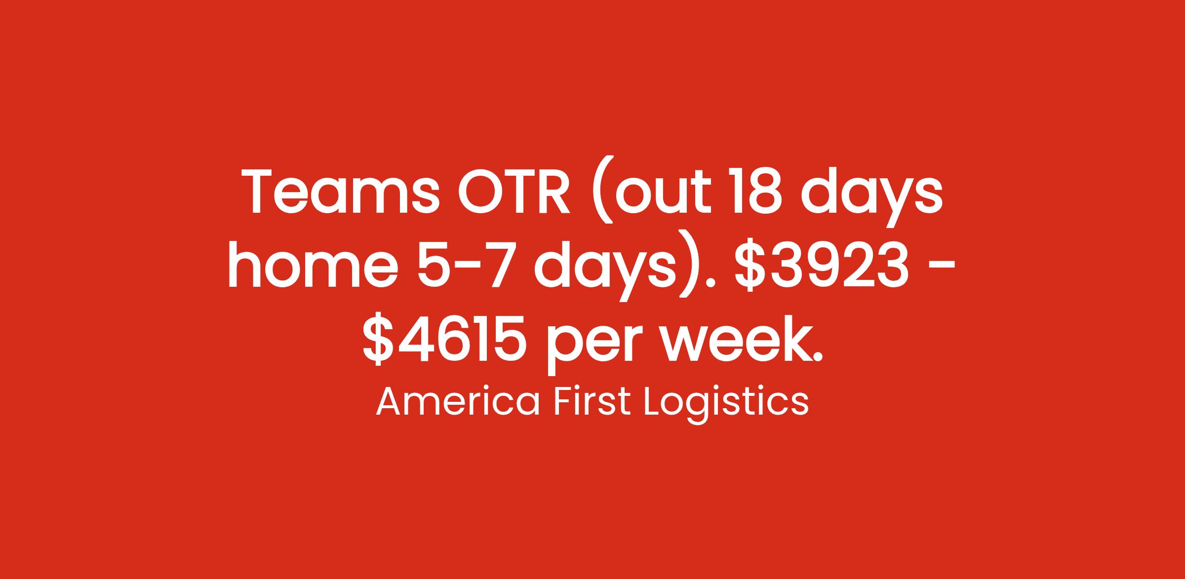 β’ Team Drivers: $1,025 each + PTO with Hazmat / $825 each + PTO without Hazmat