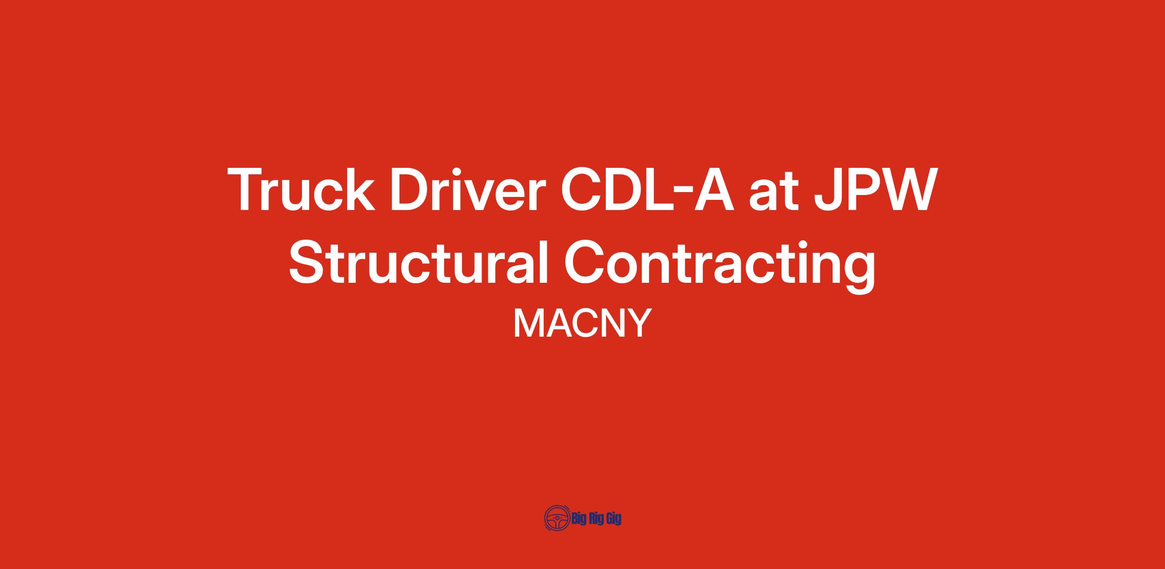 JPW Structural Contracting located in Syracuse, NY is currently seeking to add a CDL-A Truck Driver to join their team! Position is Monday - Friday, 6:00 a.m. - 4:30 p.m. with 1/2-day optional Saturdays.
